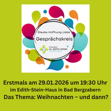 im Januar 2026 beginnt ein neuer Glaubensgesprächskreis für die Pfarrei Heilige Edith Stein. Immer am letzten Donnerstag eines jeden Monats um 19:30 Uhr wollen wir uns treffen und über den Glauben miteinander ins Gespräch kommen.