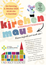 Am Sonntag, 5. Oktober feiern wir wieder um 10.30 Uhr in Steinfeld einen Gottesdienst mit unserer Kirchenmaus Edith. Die kindgerechte Feier findet parallel zum Gemeindegottesdienst statt. Eingeladen sind Kinder zwischen 4 und 8 Jahren. Wir starten gemeinsam mit den anderen Gottesdienstbesuchern in der Kirche. Vor der Schriftlesung gehen die Kinder mit dem "Kirchenmausteam" zu ihrem eigenen Gottesdienst und werden nach der Feier des Gemeindesgottesdienstes von ihren Eltern abgeholt. Die Kinder hören das jeweilige Tagesevangelium, singen, beten und hören von Jesus. Edith, unsere Kirchenmaus, ist auch dabei!